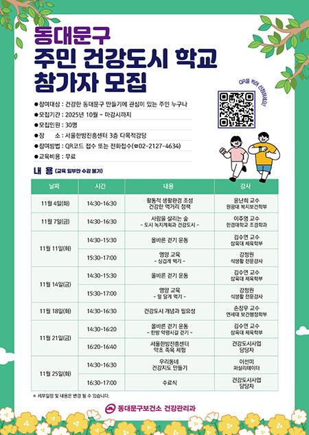 서울 동대문구는 11월 4일부터 25일까지 매주 화요일과 금요일, 서울한방진흥센터에서 **‘주민 건강도시학교’**를 운영한다고 밝혔다.