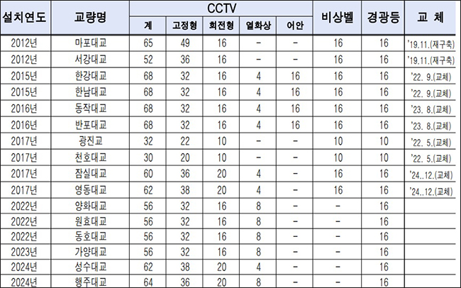 현재 서울시는 20여 개 이상의 한강 교량 중, 총 16개 관할 수난구조대(△여의도(가양, 양화 등 총 6개소), △반포(한강 등 총 4개소), △뚝섬(잠실 등 총 4개소), △광나루(광진, 천호))를 설치해 운영 중이다. 또한, 전체 한강 교량별 주요 설치 장비는 △CCTV(고정형, 회전형 등) 923개, △비상벨(비상방송) 148개, △경광등 244개가 설치되어 운영 중에 있다.