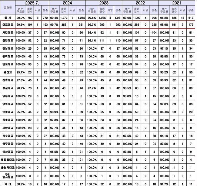 특히, 올해 ‘25년 7월 기준, 한강 교량 자살지도자(생존과 사망 포함)건수는 780건으로, 이 중 3년 연속(’22-24년) 1위를 기록한 마포대교는 194건이며, ‘24년 총건수 1,272건 대비 마포대교 건수가 352건으로 가장 높은 순위를 보이는 것으로 나타났다.
