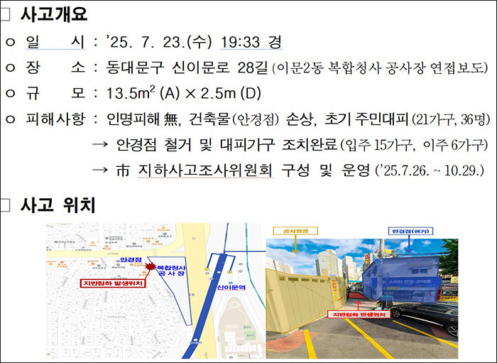 서울시는 지난 7월 동대문구 이문동 굴착공사장에서 발생한 지반침하 사고에 대해 시공·관리 부실을 원인으로 규명하고, 재발 방지를 위한 지하안전관리 강화 대책을 발표했다.