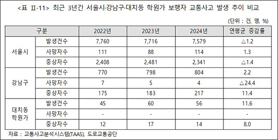 서울시의회 윤영희 의원(국민의힘, 비례)이 제안하고 서울시 재정분석담당관이 분석한 자료에 따르면, 최근 3년간(2022~2024년) 서울시 전체 보행자 교통사고는 연평균 1.2% 감소했지만, 대치동 학원가 사고는 2022년 45건에서 2024년 56건으로 늘어나 연평균 11.6% 증가했다.