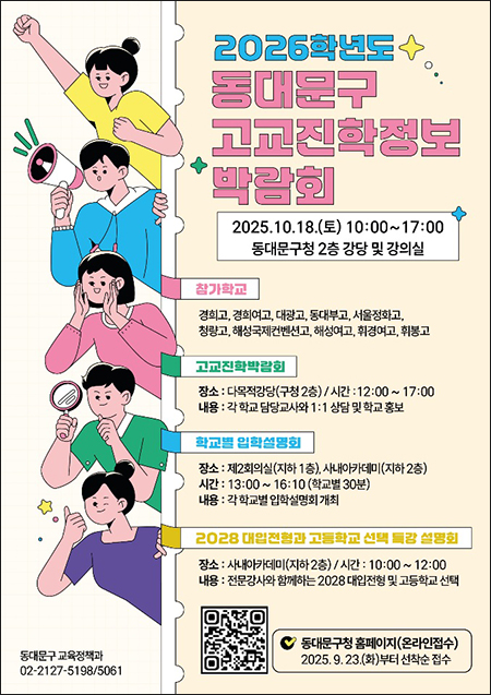 서울 동대문구는 오는 10월 18일(토) 오전 10시부터 오후 5시까지 구청 내 다목적 강당, 제2회의실, 사내아카데미에서 「2026학년도 고교 진학정보 박람회」를 개최한다고 밝혔다.