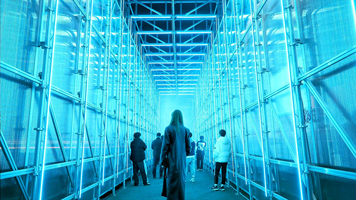 유환의 ‘빛의 터널은 청담대교 하부 공간을 따라 전개되는 몰입형 레이저 설치작품으로, 지하철이 통과할 때마다 공간이 빛의 흐름으로 물들며 관람객에게 시간과 공간을 넘나드는 듯한 특별한 체험을 제공한다.