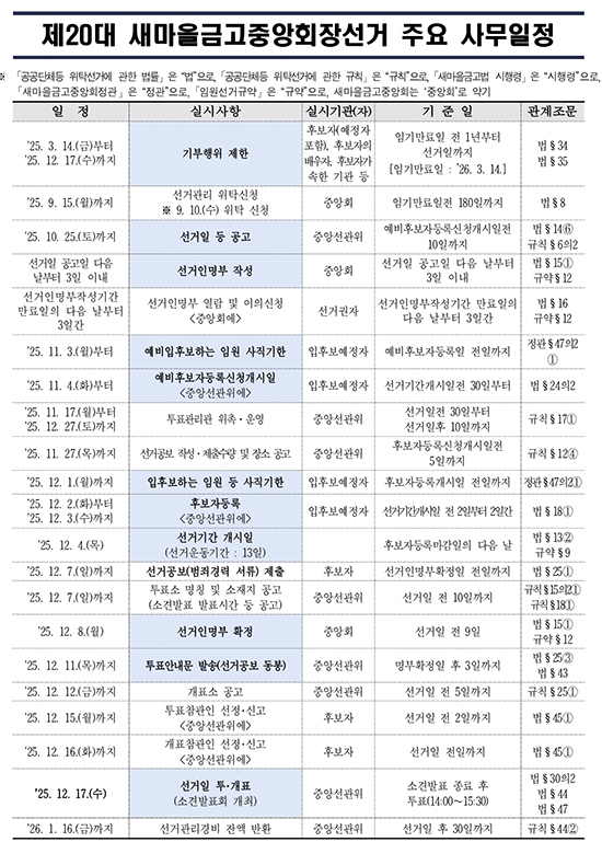 중앙선거관리위원회는 2025년 12월 17일 실시하는 제20대 새마을금고중앙회장선거와 2026년 1월 7일 실시하는 제34대 신용협동조합중앙회장선거를 관리한다.