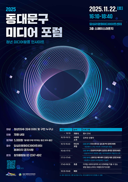 동대문문화재단 답십리영화미디어아트센터는 오는 11월 22일(토), 청년들을 대상으로 ‘2025 동대문구 미디어 포럼’을 개최한다.