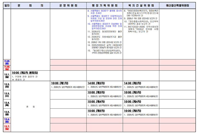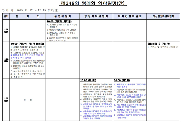 동대문구의회(의장 이태인)는 11월 27일부터 12월 19일까지 23일간의 일정으로 제348회 정례회를 개회한다고 밝혔다. 이번 정례회에서는 구정에 관한 질문의 건, 결의안 및 조례안 등을 처리할 예정이며, 특히 2026년도 일반·특별회계 세입·세출예산안 9,824억여원의 심의도 이루어질 예정이다.