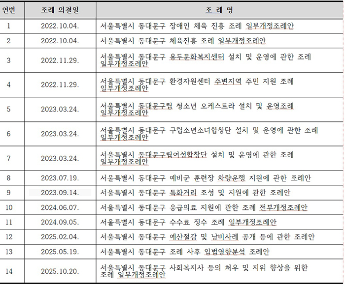 본지 동대문이슈는 창간 9주년을 맞아 지역 구민의 알권리를 충족하기 위해 동대문구의원들의 지난 3년간 의정활동 내역을 요청·게재한다. 대상 기간은 2022년 7월 1일부터 2025년 10월 31일까지로, 각 의원들의 ▲공약 추진 현황 ▲조례 발의 현황 ▲구정질문 현황 ▲5분 자유발언 현황 등이 포함된다. 이번 게재는 주민들이 선출직 의원들의 활동을 직접 확인할 수 있도록 하여, 지역 정치의 투명성과 책임성을 높이고 의정활동에 대한 평가와 참여를 활성화하는 데 목적을 두고 있다. 동대문이슈는 앞으로도 구민과 함께하는 열린 언론으로서, 지역 의정과 정책을 지속적으로 점검하고 공유할 계획이다.(편집자 주)