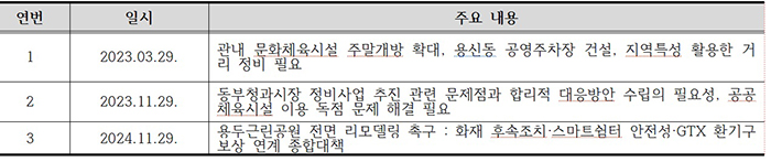 - 용두공원 GTX-B/C 노선 환기구 설치와 관련하여 충분한 주민의견수렴 절차가 이뤄지지 못한 점도 아쉬운 부분임. 향후 국토부 기부채납 등을 활용하여 공원 환경개선이 이뤄질 수 있도록 노력하겠음