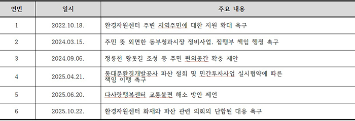 - 동대문환경자원센터 대형화재로 인해 구민들의 피해가 지속되는 것임. 향후 서희건설에 대한 철저한 책임 배상 이행 촉구를 통해 주민 피해가 최소화되도록 노력하겠음