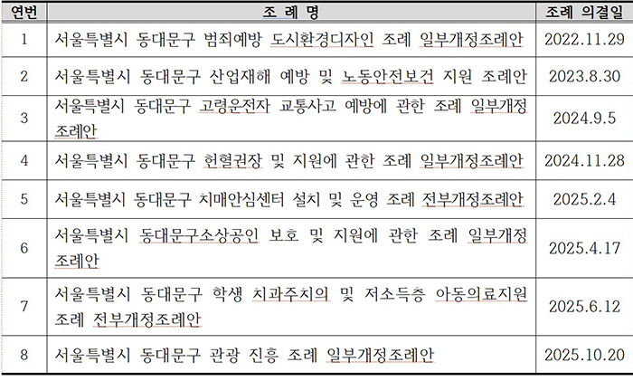 본지 동대문이슈는 창간 9주년을 맞아 지역 구민의 알권리를 충족하기 위해 동대문구의원들의 지난 3년간 의정활동 내역 등을 요청·게재한다. 대상 기간은 2022년 7월 1일부터 2025년 10월 31일까지로, 각 의원들의 ▲공약 추진 현황 ▲조례 발의 현황 ▲구정질문 현황 ▲5분 자유발언 현황 등이 포함된다. 이번 게재는 주민들이 선출직 의원들의 활동을 직접 확인할 수 있도록 하여, 지역 정치의 투명성과 책임성을 높이고 의정활동에 대한 평가와 참여를 활성화하는 데 목적을 두고 있다. 동대문이슈는 앞으로도 구민과 함께하는 열린 언론으로서, 지역 의정과 정책을 지속적으로 점검하고 공유할 계획이다.(편집자 주)