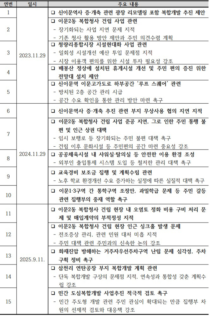 - 신이문역 시설개선 사업 관련하여 동대문구청과 코레일 간 협의 지연 등으로 전체 착공 일정 지연이 장기화되는 상황이 계속됨. 그러나 동대문구청·코레일·국토교통부 등 관계 기관과의 긴밀한 협의를 지속해 주민 숙원사업을 반드시 완수하겠음.