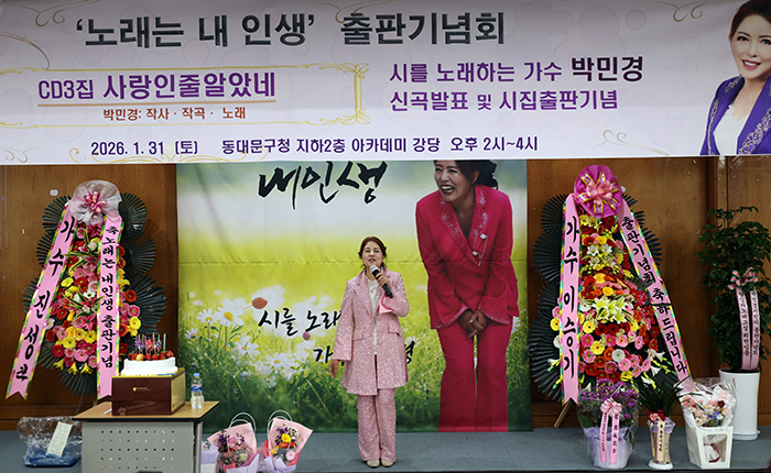 박민경 시인(가수)의 첫 시집 출판기념회가 1월 31일 오후 2시 동대문구청 아카데미 강당에서 열려 가족과 팬들 그리고 주민들 그리고 지역사회 인사들이 함께 축하했다.