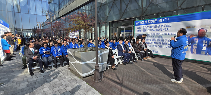 김인호 예비후보는 인사말에서 자신의 성장 과정과 정치 이력을 소개하며 지지를 호소했다. 그는 “가난한 환경 속에서 상경해 신문 배달과 공장 생활을 하며 공부를 이어갔다”며 “동대문 신설동 검정고시 학원을 계기로 이 지역과 인연을 맺었다”고 회고했다.