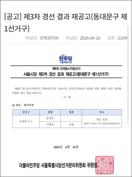 이 같은 논란 속에 중앙당 최고위원회(제267차)가 이영남 예비후보의 재심 신청을 인용하는 의결을 내렸고, 이를 근거로 더불어민주당 서울시당 선거관리위원회가 경선 결과를 재공고하며 최종 결과가 변경됐다.