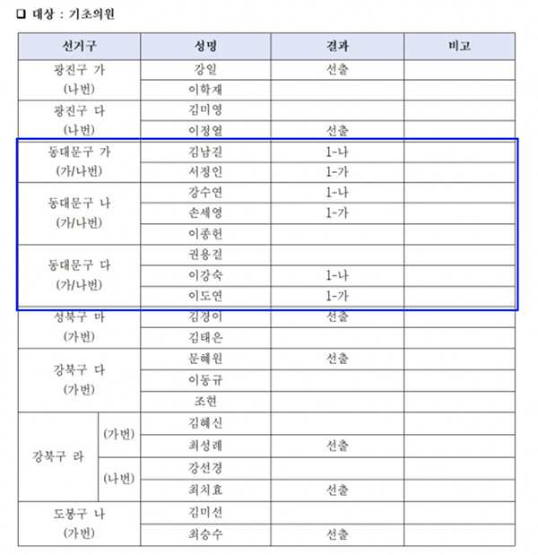 이번 경선 결과 구의원 가 지역(신설동·용두동)은 서정인 후보가 1-가, 김남길 후보가 1-나로 결정됐다. 나 지역(제기동·청량리동)은 손세영 후보가 1-가, 강수연 후보가 1-나로, 다 지역(회기동·휘경1·2동)은 이도연 후보가 1-가, 이강숙 후보가 1-나로 각각 확정됐다.