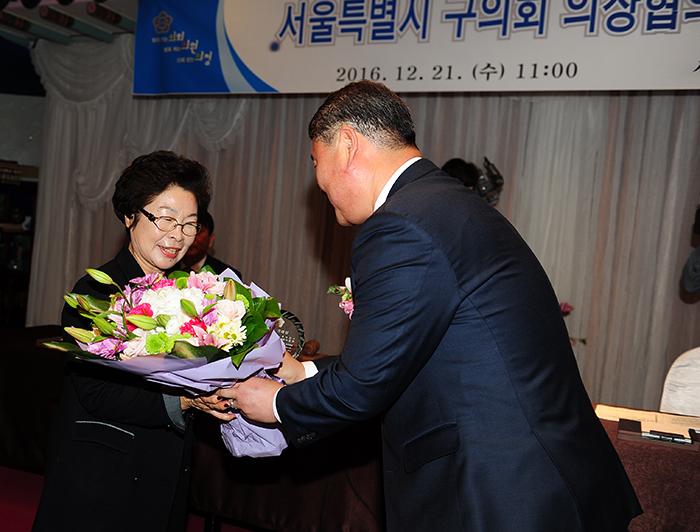 이순영 의원이 정형진 서울시 구의회 의장협의회장으로부터 '의정대상'을 수사상하고 있다.