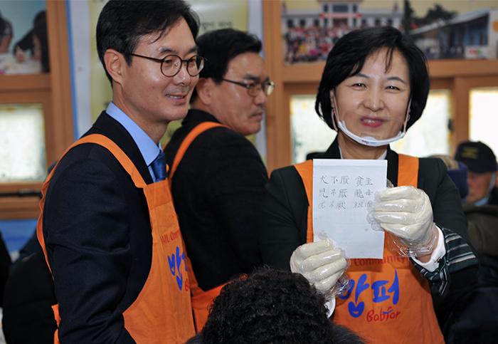 배식봉사 소감을 묻는 기자의 질문에 “우리민족 최대명절인 설을 맞아 지역내 어려운 분들을 위한 다일공동체의 밥퍼 배식봉사에 함께 하게돼 매우 뜻깊었습니다.”