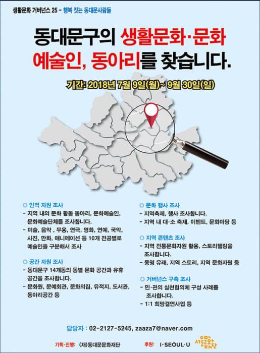 아울러 동대문문화재단은 지역의 동아리, 예술가 단체, 예술 행사 등을 한눈에 찾아볼 수 있는 생활문화지도 어플 ‘동대문 문화로드’ 및 문화지도 책자도 제작할 계획이다.