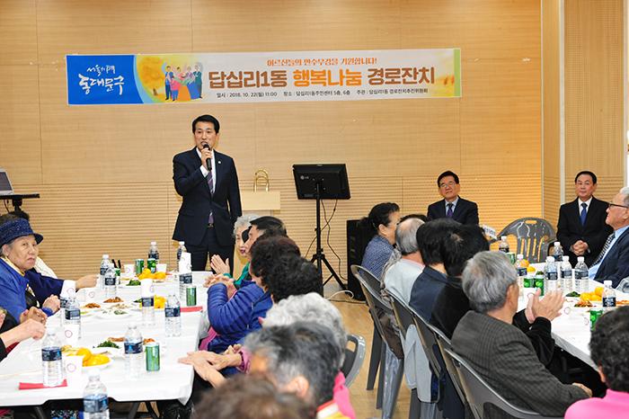 ▲서울 동대문구의회 김창규 의장이 22일 오전 열린 전농2동과 답십리1동 경로잔치에 참석하여 어르신들 노고와 건강을 기원하는 인사말을 하고 있다.