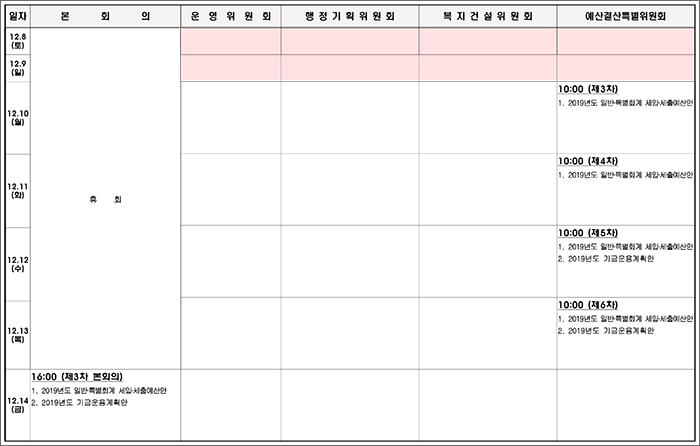 - 11.27~12.14일까지, 2019년도 새해 예산안 5,724억여원 심의, 겨울철 종합대책 보고 청취, 구정질문 및 조례안 처리 등 처리