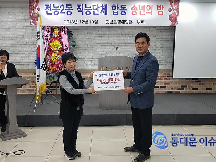 한편 전농2동 주민자치위원회는 사랑의성금과 김치 146박스 환가액 949만원 상당을, 통장협의회는 사랑의 성금 105만원을, 바르게살기위원회는 성금과 쌀 127만원 상당을, 새마을지도자협의회는 사랑의 이블과 쌀 89만원 상당을 서울사회복지공동모급회에 전달하고 이날 전달식을 가졌다.