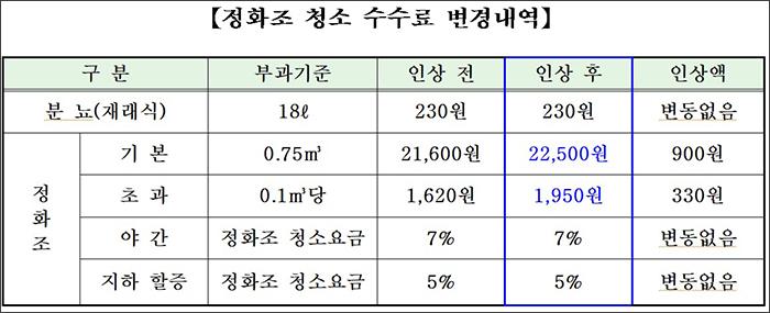 서울 동대문구(구청장 유덕열)는 2013년 이후 지금까지 동결시켜 왔던 정화조 청소 수수료를 오는 6월 1일부터 기본수수료는 0.75㎥당 21,600원에서 22,500원으로 900원, 초과수수료는 0.1㎥당 1,620원에서 1,950원으로 330원 인상한다고 밝혔다.