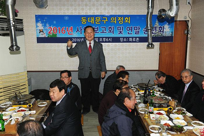 서울 동대문구의정회(회장 최병조)128일 오후 6시 용신동 화로촌에서 김구하 강태희 전 의장과 박창익 박승구 전 부의장, 조성언 이기오 유혜경 박창복 전건영 편영배 전 구의원, 신복자 구의원 등 전현직 동대구의회 의원 40여명이 참석한 가운데 ‘2016년도 사업보고 및 연말 송년를 가졌다.