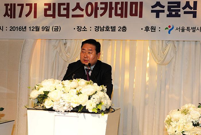 주정 동대문구의회 의장은 “김봉식 이사장님은 과거 정치를 하신분이라 참 다르다.”며 소상공인회의 비약적으로 발전을 축하했다. 또 “7기 70여분의 10주간 강좌의 수료식을 축하드린다. 2016년 남을 날 마무리 잘 하시고 2017년 새해에는 모두 건강하시고 행복하시길 빈다”고 인사했다.