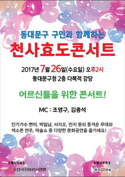 서울 동대문구(구청장 유덕열)은 7. 26(수) 오후 2시 동대문구청 강당에서 사)전국자원봉사연맹(회장 안천웅)과 천사연예인협회가 주최하는 ‘동대문구민과 함께하는 천사효도 콘서트’를 개최한다고 밝혔다.