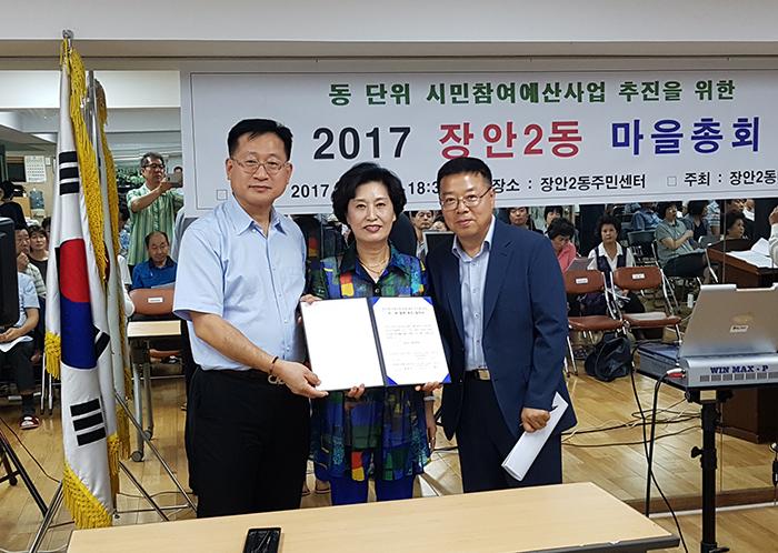 | ▲장안2동 한창용 주민자치위원장, 서인자 마을회장, 송은식 동장이 민관협약서에 서명날인을 했다.(사진 동대문 이슈) |