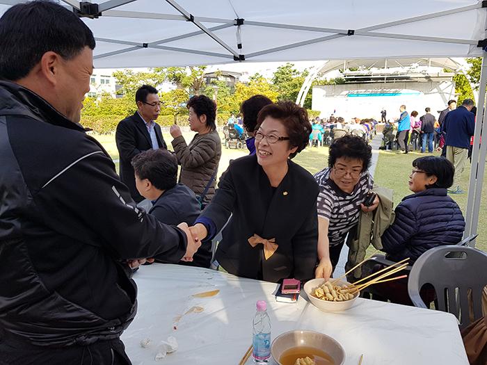 ▲이순영 동대문구의회 구의원이 13일 오후5시 용두근린공원 ‘용신동 어울림 한마당’ 주민화합잔치에서 주민과 반갑게 악수를 나누고 있다.