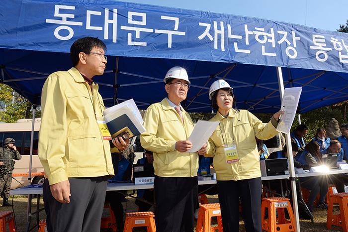 ▲유덕열 동대문구청장(가운데)이 2017 재난대응안전한국훈련에 참가해 재난현장을 점검하는 모습(사진 동대문구)