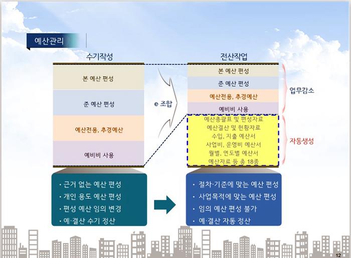 이렇게 되면 예산 편성부터 수입 지출 등 회계처리 등 조합 자금의 관리?집행과 인사, 행정을 아우르는 정비조합 내 모든 문서가 100% 전자화된다. 공공기관이나 민간기업처럼 정비조합에도 전자결재 시스템을 전격 도입해 조합운영의 투명성을 담보한다는 계획이다.