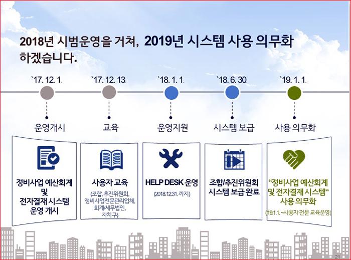 서울시는 내년 시범운영을 거친 뒤 관련 조례(서울시 도시 및 주거환경정비조례)를 개정해 '19년부터 전 조합?추진위를 대상으로 시스템 사용을 의무화한다는 계획이다.