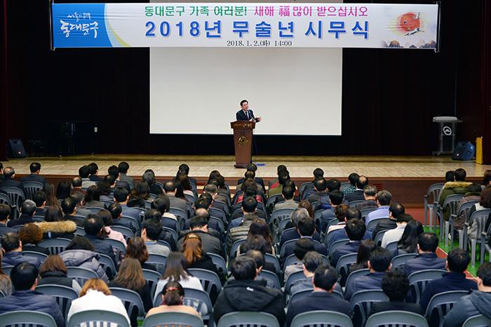 서울 동대문구가 무술년 새해를 맞아 2일 오후 2시 구청 다목적강당에서 2018년도 시무식을 갖고 구민의 안전과 행복, 민생 안정에 방점을 두는 2018년 새해 출발 각오 다짐했다.
