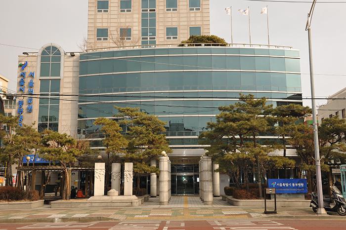 ▲서울시 동부병원의 전면부에 중앙현관 진출입로에 큰 수목과 중앙 돌기둥, 파고라, 의자 등이 빼곡이 들어서 병원 전면부를 가리고 있다.(사진 동대문 이슈)