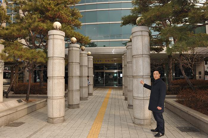 | ▲서울시의회 전철수 시의원이 동부병원 중앙현관 진출입로를 답답하게 가리고 있는 철거돼야할 돌기둥 등을 가리키고 있다.(사진 동대문 이슈) |