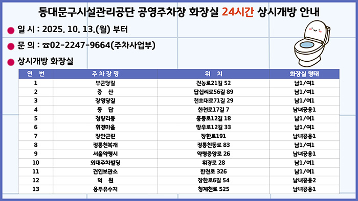 동대문구시설관리공단(이사장 박희수)이 부분 개방하던 공영주차장 13개소 화장실을 10월 13일(월)부터 24시간 상시 개방한다고 밝혔다.