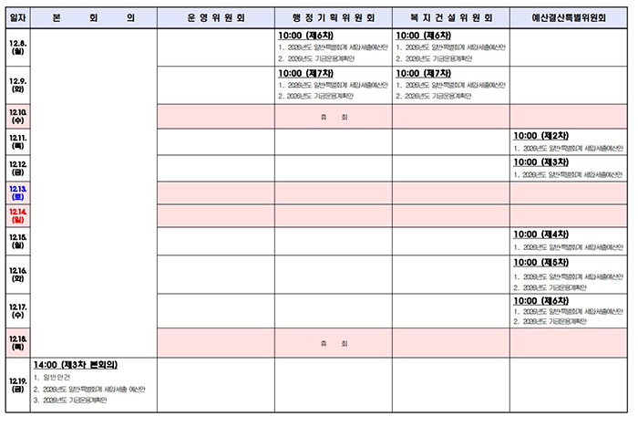정례회 마지막 날인 19일 오후 2시 본회의장에서 제3차 본회의를 개의하여 각 상임위원회와 예산결산특별위원회에서 심사를 거친 2026년도 예산안과 조례안 등 일반 안건들을 처리한 후 산회할 예정이다.