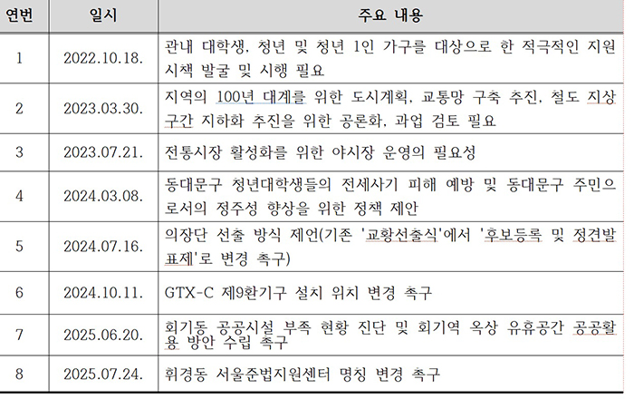 - 회기동 주민센터 개선 혹은 이전에 관한 가시적인 성과가 부족했던 점, 공공시설 부족으로 주민 편익에서 소외된 문제점