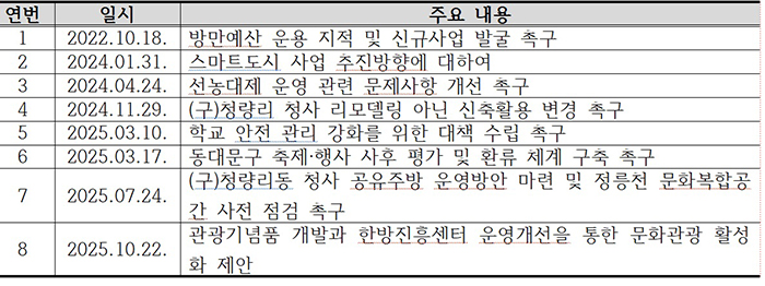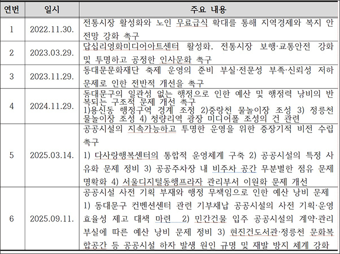 - 구정질문을 통해 부실한 축제 운영과 기부채납 시설의 사전기획 미비 문제를 지속적으로 제기했음에도, 구청의 시정조치가 충분히 이행되지 않은 점.