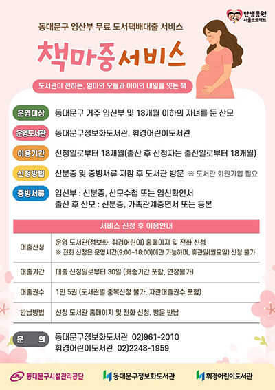 서비스 대상은 동대문구 거주 임산부 및 출산 후 18개월 이하 자녀를 둔 산모이며, 임신확인서 또는 주민등록등본을 지참해 도서관 안내데스크에서 신청할 수 있다. 월 1회 최대 5권까지 대출 가능하며, 대출기간은 배송 포함 최대 30일이다.