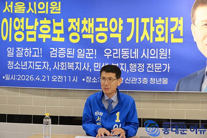 이영남 더불어민주당 동대문구 시의원 제1선거구 후보(신설동·용두동·제기동·청량리동)는 21일 오전 경동시장 청년몰에서 기자간담회를 열고 6월 3일 지방선거 출마 소회와 함께 동별 맞춤형 정책공약을 발표했다.