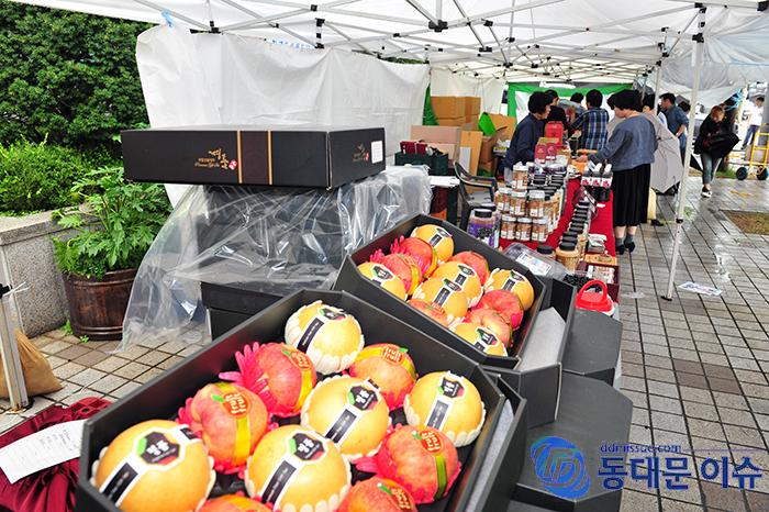 오전 10시에 구청 앞 광장에선 자매도시인 상주, 청양, 여주, 나주, 남해, 춘천, 제천, 부안, 보성, 순창, 연천, 음성, 청송 13개 시?군에서 생산된 농?특산물 100여 품목이 광장에 마련된 판매대에 가득 채워졌다.